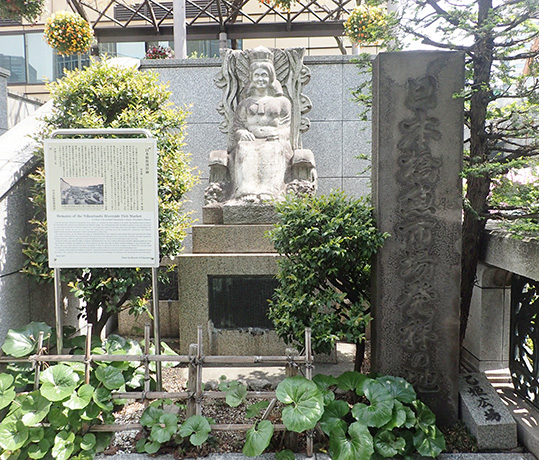 1654年(昭和29年)に、日本橋北詰東の地に日本橋魚市場関係者が「日本橋魚市場発祥の地」と刻まれた記念碑と乙姫像が置かれました。乙姫をイメージした像は、龍宮城の住人である海の魚がことごとく日本橋に集まったという意味を込めて作られたそうです。
