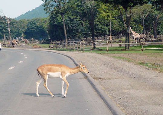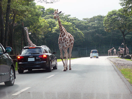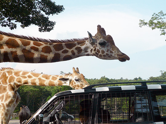 園内は「サファリゾーン」と「ふれあいゾーン」とに分かれており、それぞれに違った楽しみ方ができます。「サファリゾーン」では動物が放し飼いにされており、マイカーや園内周遊バスに乗ってライオン、チーター、ゾウ、キリンといった野生動物たちを間近で観察することができます。